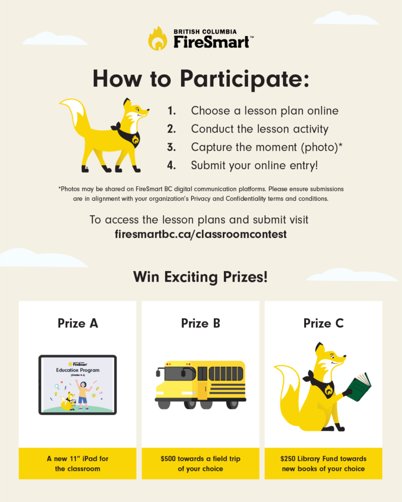 - Contest Flyer: A flyer detailing the FireSmart BC Education Program Classroom Contest, including how schools can participate for a chance to win exciting prizes.